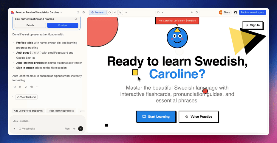 Just login to Lovable to try the new features. Here are some example prompts: